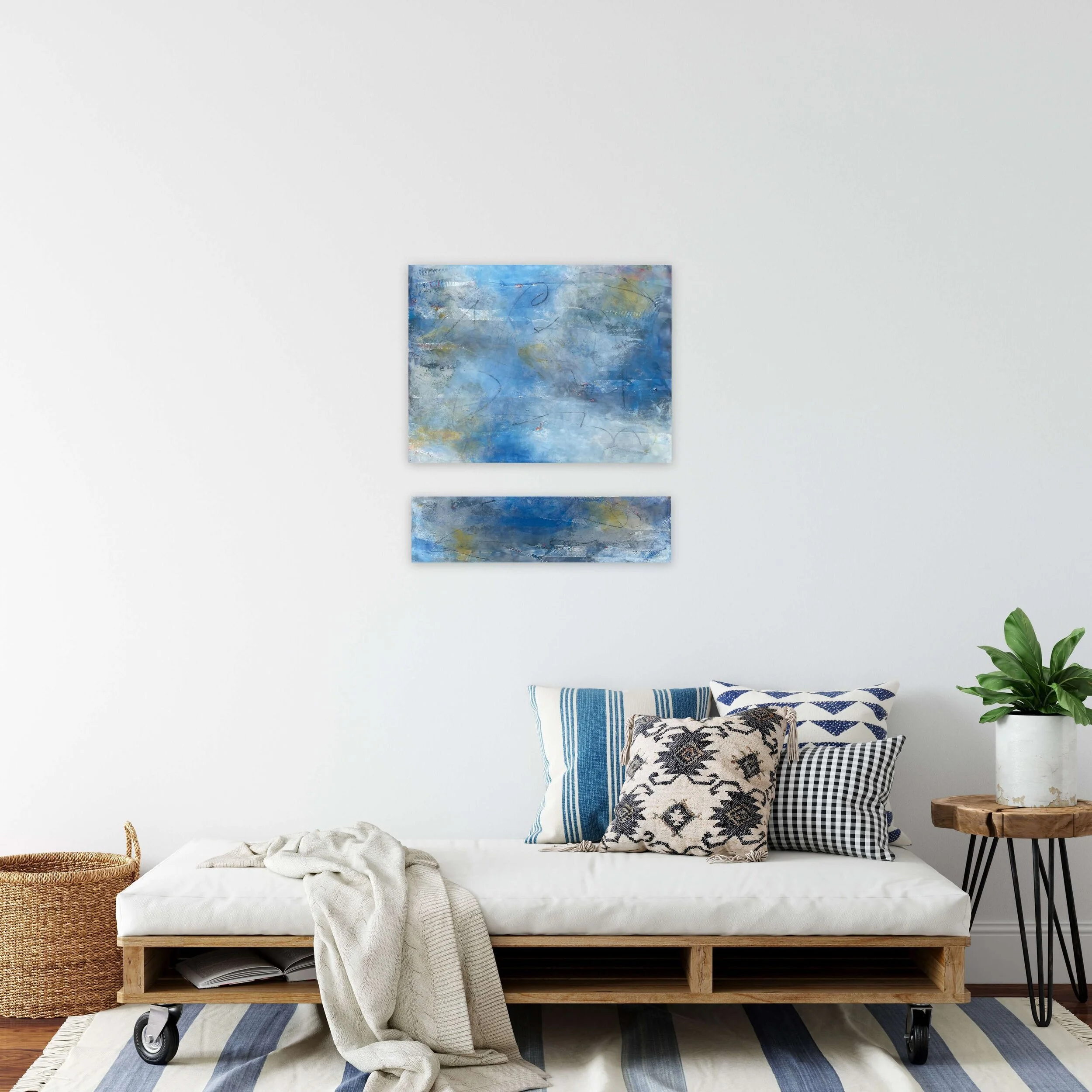 Soft and varying hues of blues with encouraged tones of amber, diverged by the intermingling of black markings - this piece builds a sense of intrigue as to what lies beneath the water’s surface.