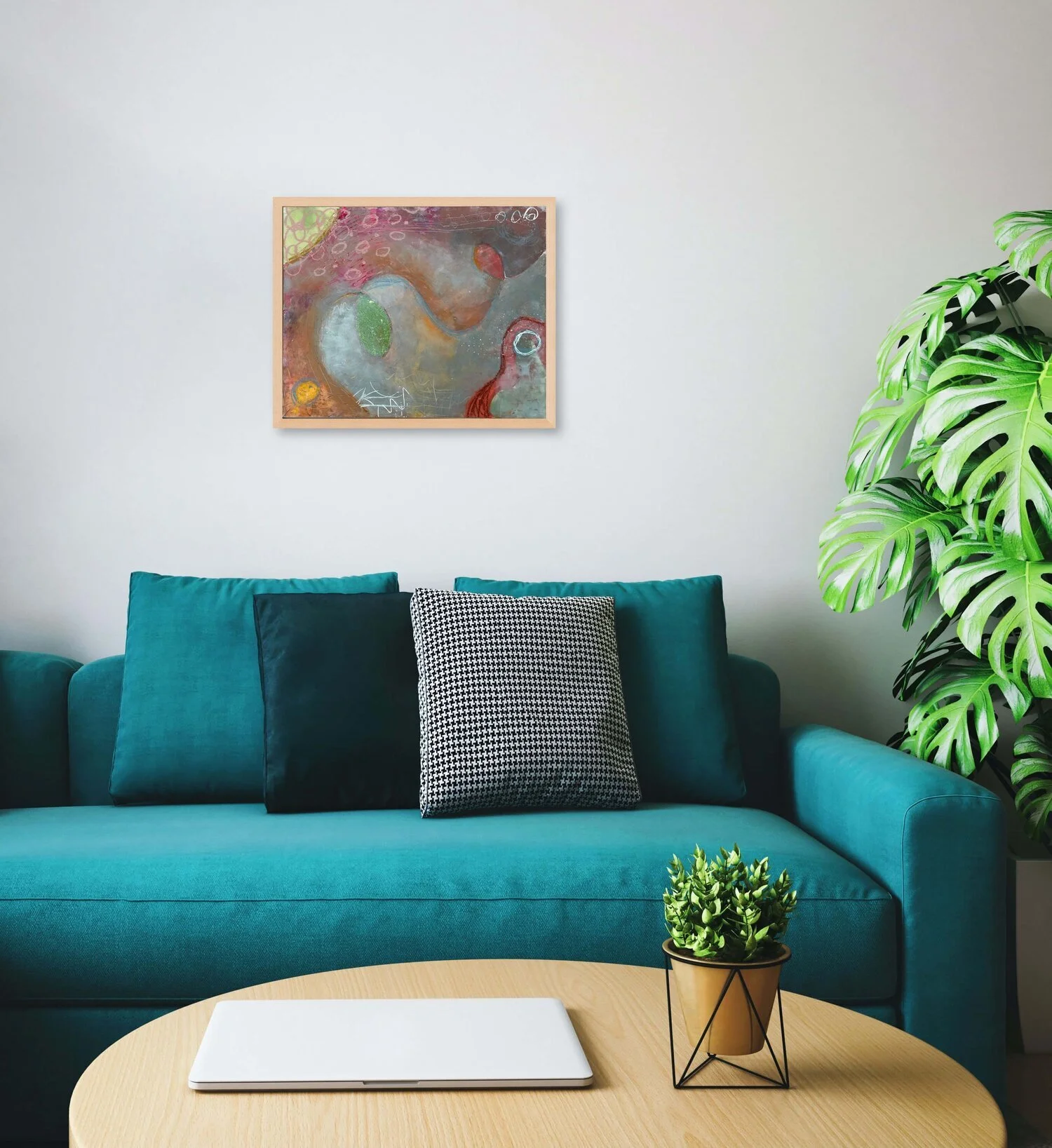 Muted greys with happy tones of greens, reds and blues, paired with energetic highlights - this piece generates a sense of wonderment and awe.
