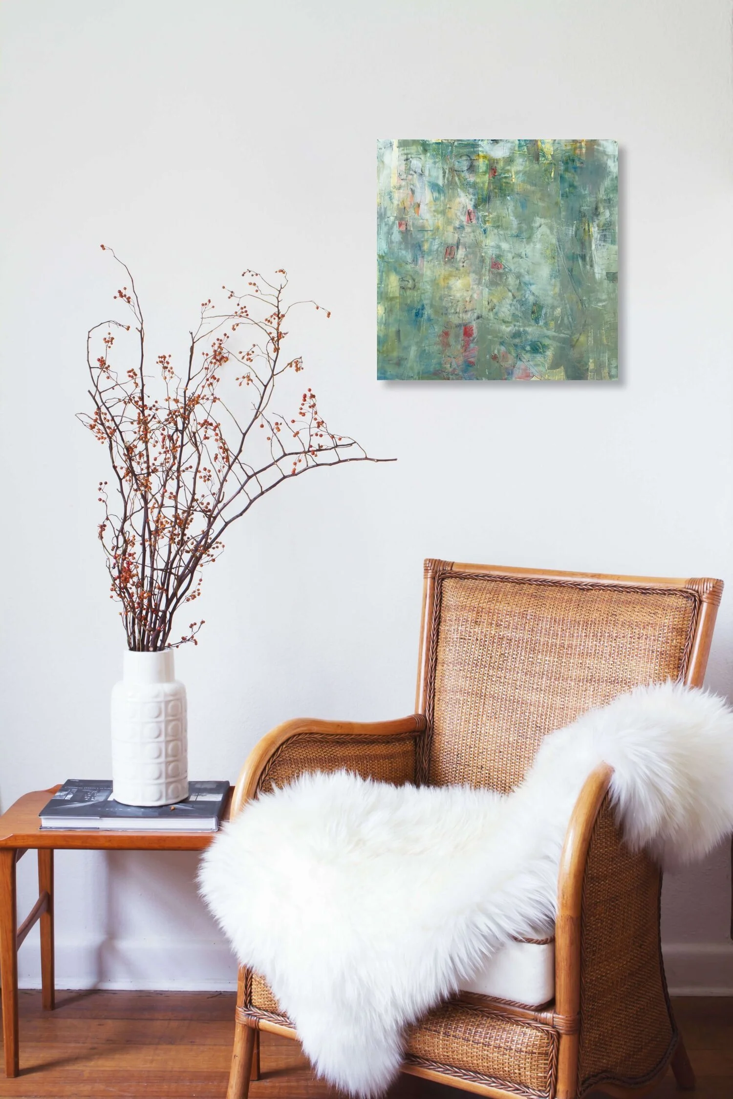 Quiet greens integrated with misshapen squares of happy reds and yellows - this piece forges a sense of calm amongst the vibrant energy.